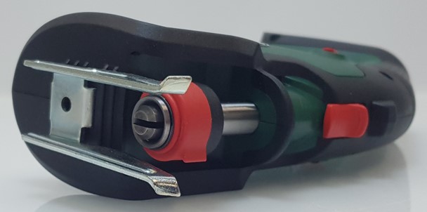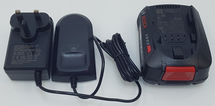 W zestawie akumulator 18 V 2,0 Ah, ładowarka, hak, ostrze