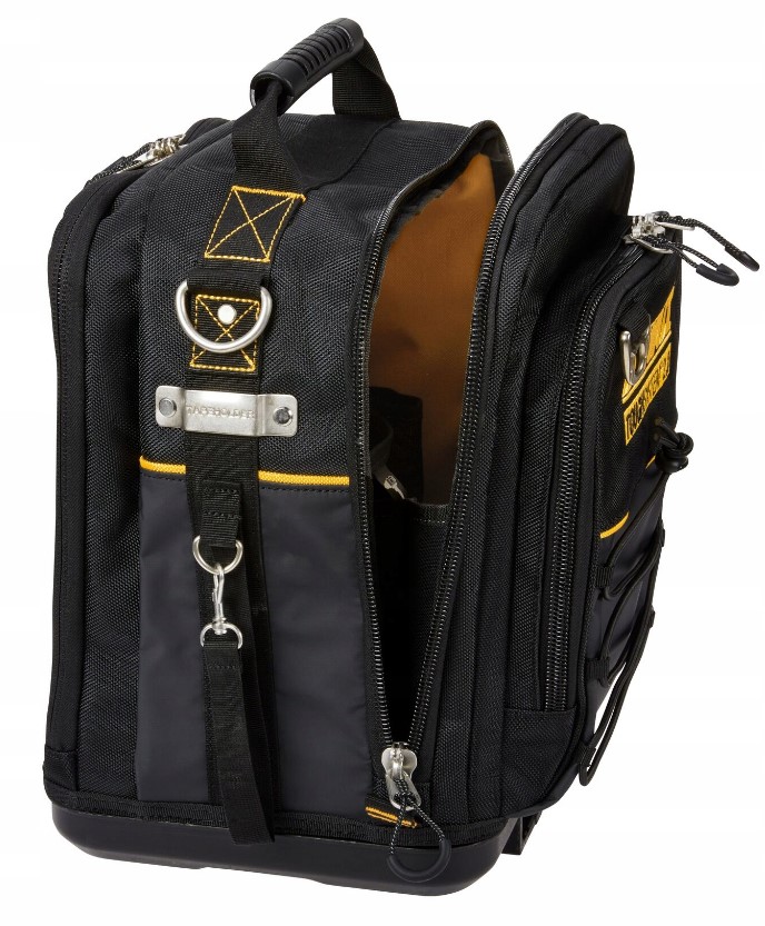 Wnętrze torby zawiera ponad 25 kieszeni, które pomagają w organizacji i przechowywaniu narzędzi, w tym dedykowaną kieszeń na wkrętarkę i telefon.