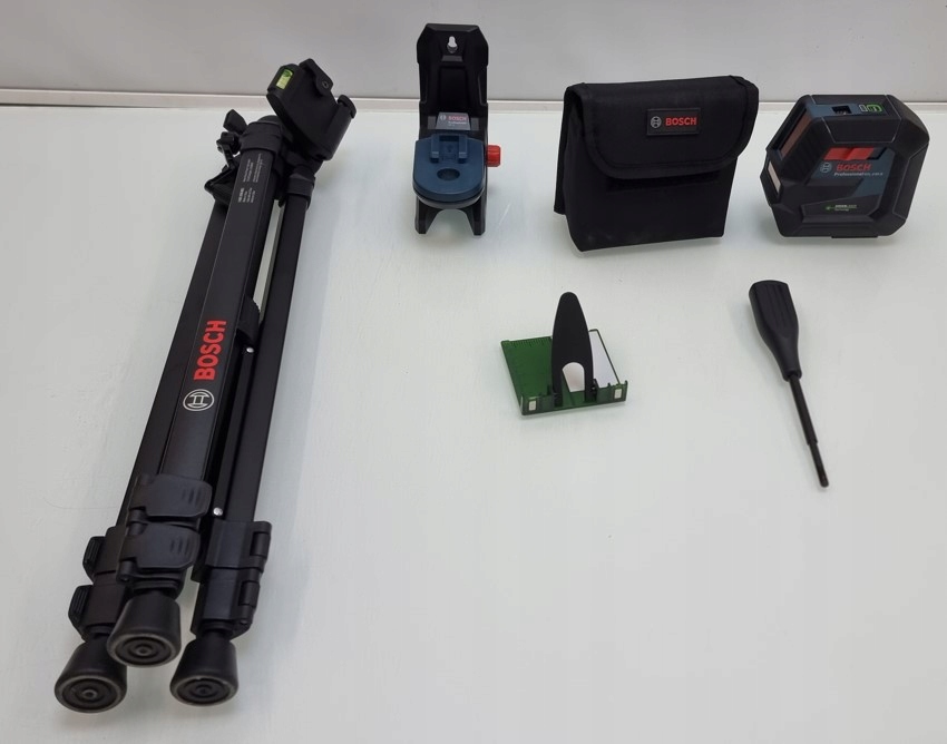 W zestawie statyw, odbiornik laserowy, uchwyt z magnesem oraz etui na laser