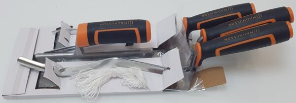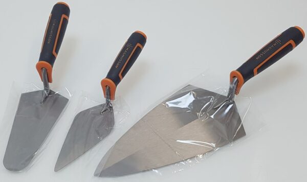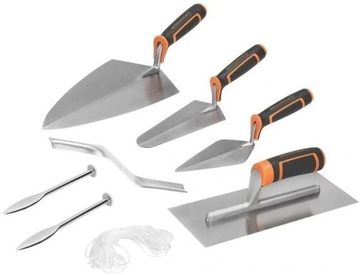 Paca szpachlowa 6″, kielnia miernicza 7″, paca do cegieł 11″, kielnia tynkarska 11″, narzędzie do spoinowania zaprawy i kołki liniowe z linią ceglaną