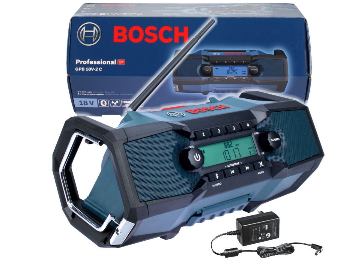 GPB 18V-2 SC Professional firmy BOSCH to budowlane radio stereofoniczne z cyfrowym tunerem FM z dualnym systemem zasilania (sieciowym i akumulatorowym) oraz z gniazdem AUX-IN typu Jack 3,5mm do podłączenia zewnętrznego źródła muzyki, np. odtwarzacza plików MP3, czy telefonu.