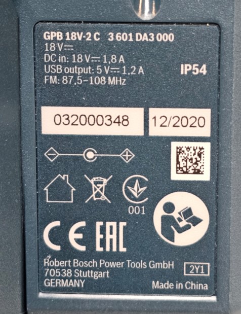RADIO BUDOWLANE GPB 18V-2 C BOSCH Bluetooth EAN (GTIN) 4059952507811