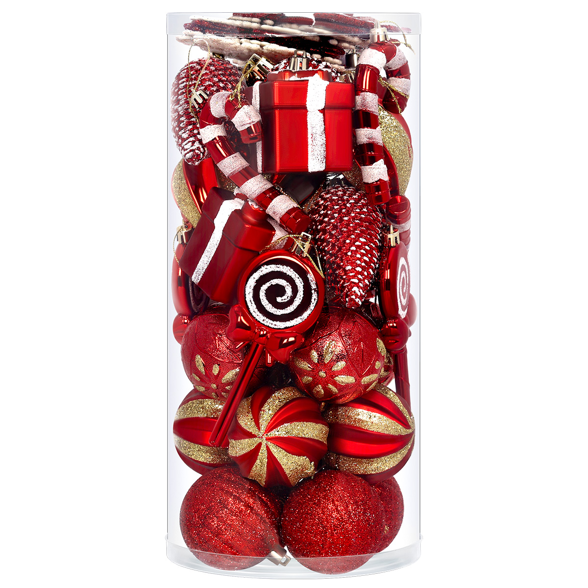 - Zawartość zestawu: bombki, śnieżynki, prezenty, laski cukrowe, lizaki, stożkowe ozdoby