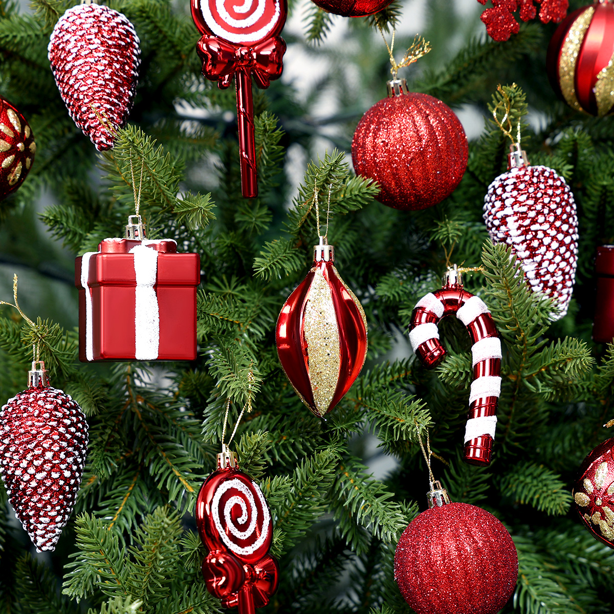 Stwórz magiczną i radosną atmosferę świąt z bombkami StarryLights! Ten wyjątkowy zestaw zawiera klasyczne bombki w odcieniach czerwieni i złota oraz oryginalne ozdoby: cukrowe laski, prezenty, lizaki i śnieżynki. To komplet, który doda Twojej choince ciepła, koloru i bajkowego klimatu Bożego Narodzenia.