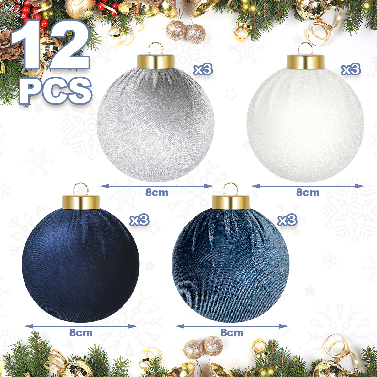 Nadaj swojej choince elegancki, zimowy wygląd z bombkami StarryLights 9183! To stylowy zestaw ozdób w odcieniach granatu, srebra i bieli, wykonanych z delikatnego weluru o aksamitnej strukturze. Subtelne, matowe wykończenie sprawia, że bombki pięknie komponują się z choinkami w stylu glamour, skandynawskim i klasycznym.